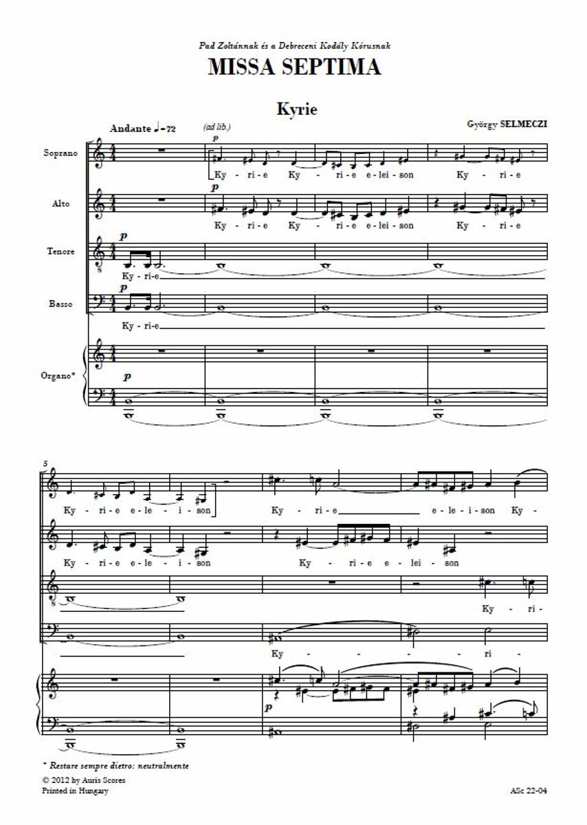 A zeneszerzőnek igen jelentős egyházzenei oeuvre-je van: nem kevesebb, mint tíz mise, számos latin himnusz és antifóna, magyar vallásos szövegek és népénekek megzenésítése szóló énekhangokra és kórusra, különböző hangszer-együttesekkel vagy csak orgonával kísérve… Latin szövegű 7. miséje (2014) a teljes liturgikus szöveget (a Credo résszel együtt) feldolgozó missa solemnis. A szerző számos, egyszerűbb felépítésű miséjétől eltérően a 7. egy hivatásos kórus képességeinek megfelelő, összetettebb zenei nyelvet alkalmaz. Ami azonban állandó, az a könnyed játékosság, amellyel a zeneszerző a legnagyobb természetességgel köti össze egymástól távol álló zenei világok (barokk, gregorián, magyar népdal) zenei elemeit. A mise ajánlása Pad Zoltánnak és a Debeceni Kodály Kórusnak szól.