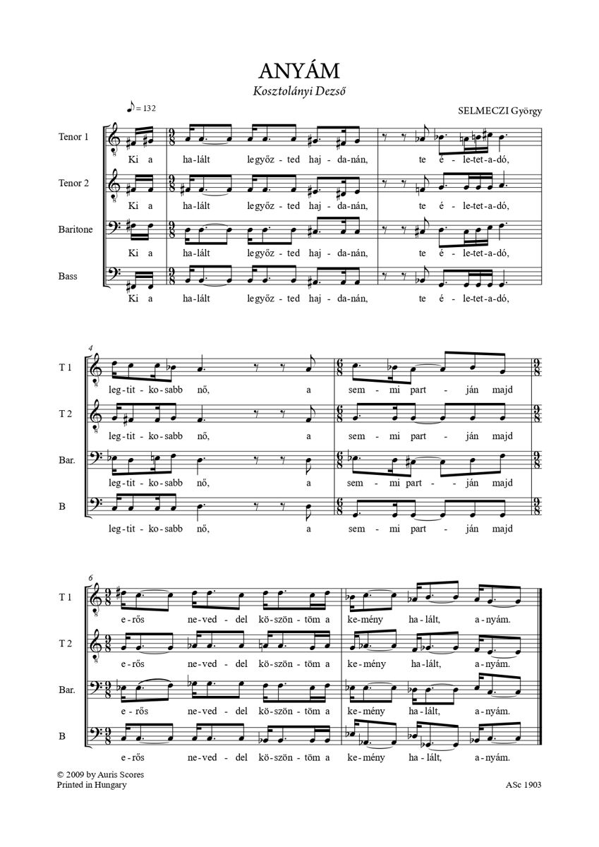 The miniatures written for divided tenor, baritone and bass voices, are based on the epigrammatic brevity and witty lines of two 20th century Hungarian poetry geniuses. Kosztolányi's poems are fragments of a series of death-toned poems entitled Negyven pillanatkép (Forty Snapshots). Selmeczi’s settings are text-centred, the pithy rhymes are excellently underlined by the isorhythmic text treatment. Árpád Tóth's poem "A final true word..." (from the Fragments) is more complex, with a more versatile treatment of the voices, while " Looking at women in autumn…" (also from the Fragments) is, with the exception of a few bars, practically a song for the tenor part, with a "buzzing choir" accompaniment of baritone and bass. Of particular interest are the whistle or falsetto interjections that complement the main melodic line as a real countersubject.