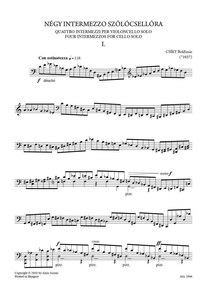 Csíky Boldizsár (*1937) az erdélyi zeneszerzés doyenje a régi mesterek módjára a legváltozatosabb műfajokban komponál. Zenekari művek, kantáták, színpadi kísérőzenék, dalok, kórusművek, kamarazene opusok jelentékeny száma alkotja a szerzői oeuvre-t. A cselló hangzása, színe különösen megragadta fantáziáját, meglepő módon még szabályos öttételes misét is komponált szóló csellóra (Missa instumentalis). 2010-ben írott intermezzói a barokk szólócselló-szvitek kortárs utánérzései, a tételek tempójelzései ciklikus gondolkodásra utalnak, de önálló darabokként is előadhatók.