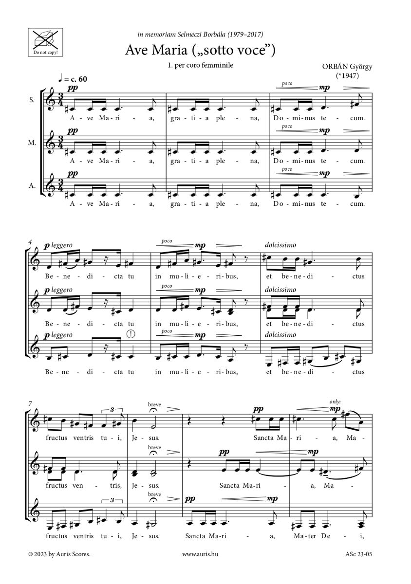 Orbán György a vokális zene elkötelezett mestere, igen jelentős dal-, kórus-, világi- és egyházzenei œuvre-vel. Az 1990-es években öt Mária-ima megzenésítés került ki a zeneszerző műhelyéből, a 2023-ban kiadott, „sotto voce” Ave Maria a hatodik, egy fiatalon eltávozott zenésztárs és barát emlékére készült. A négy változat (nőikar, vegyeskar, zongorakíslrete dal és szóló zongora) zenei anyaga alig tér el egymástól. Talán a „sotto voce” jelölésből következik, hogy a zene dinamikai skálája a pp-mp körön belül marad, a csendes suttogás hangulatát csupán a záró „Amen” forte felkiáltása szakítja meg.