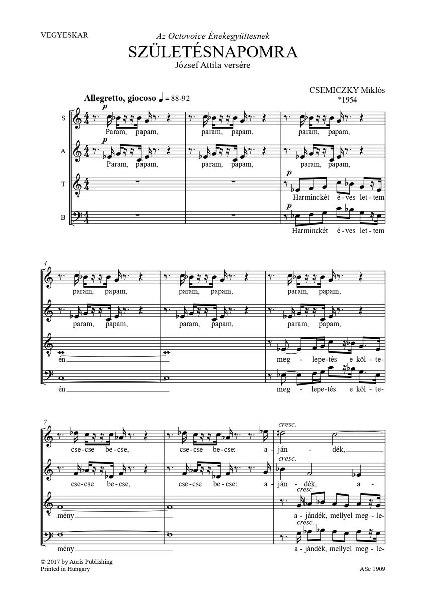 A zeneszerző 2017-ben zenésítette meg József Attila emblematikus költeményét, a keserű humorú verset, amelynek számos sora és rímjátéka ma már az élő beszéd szerves részeként rögzült a magyar nyelven beszélők tudatába. A költemény egyik messziről felismerhető jellegzetességei a viccesen ritmikus szó- vagy szótagismétlések, amelyeket a szerző éles (ál)pontozott-ritmusokkal húz alá. A 10 azonos szerkezetű rövid versszakot a szerző a szöveg jelentését tükröző ún. végigkomponált módon zenésíti meg. A darab ajánlása az Octovoice Énekegyüttesnek szól.